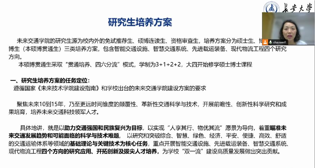崔华就研究生培养方案进行了介绍,重点讲解了“贯通培养、四六分流”的培养模式,并从研究生培养的任务定位、目标定位、人才培养课程体系等方面进行了详细讲解,强调了培养过程中“一流师资、一流平台、一流体制”的育人保障。