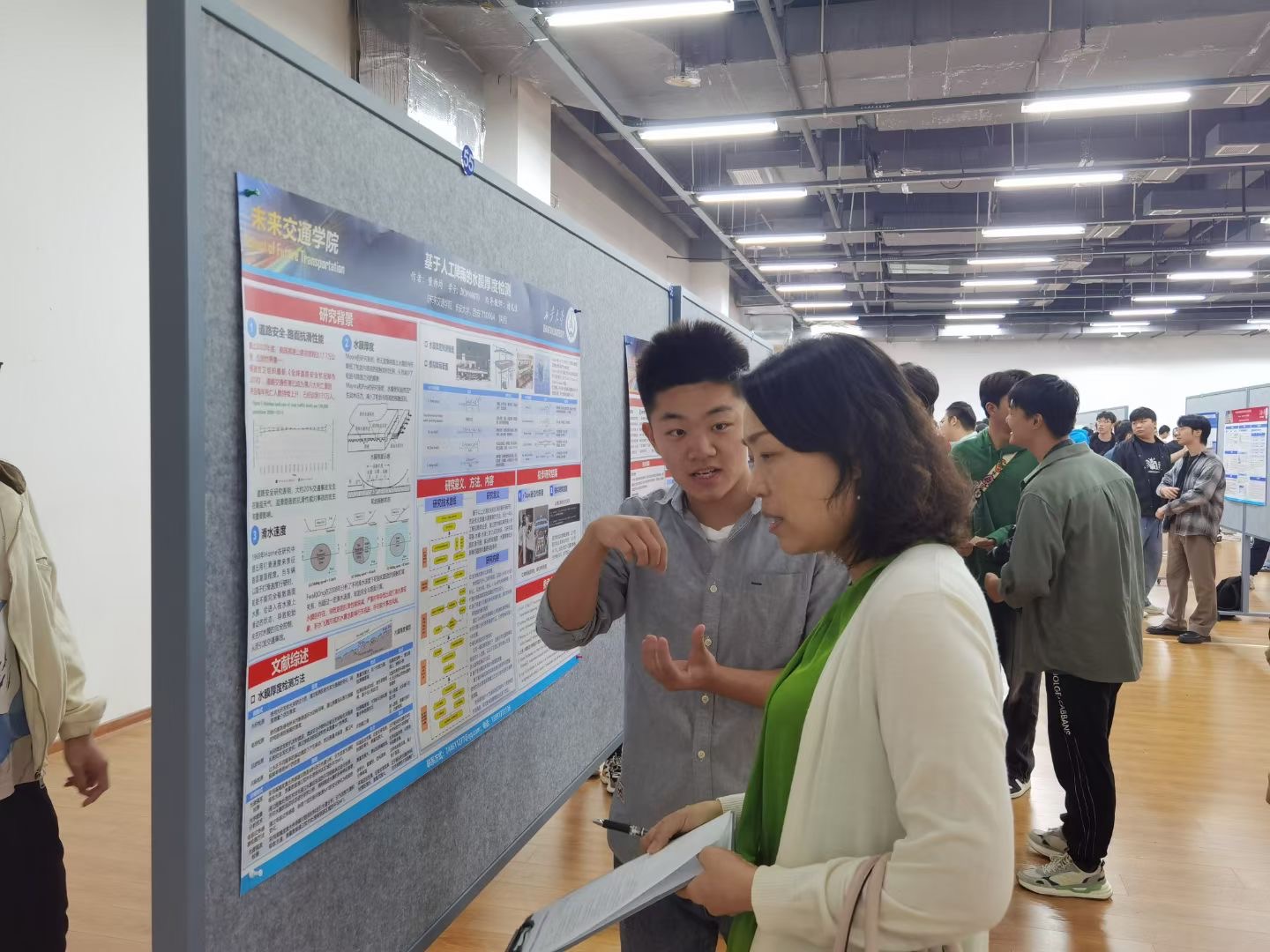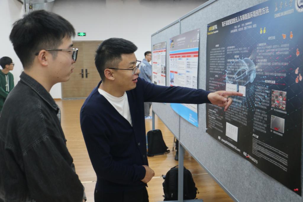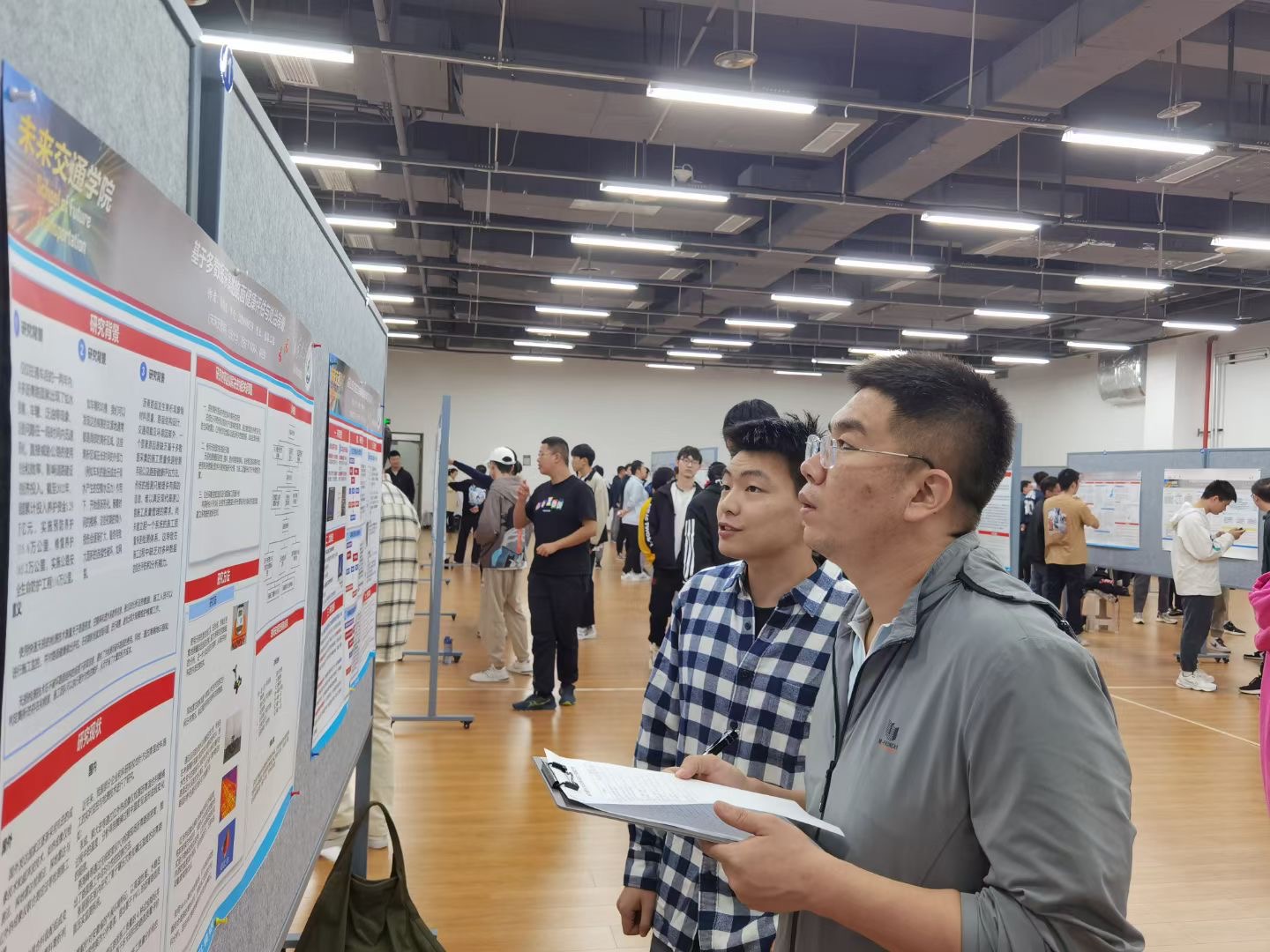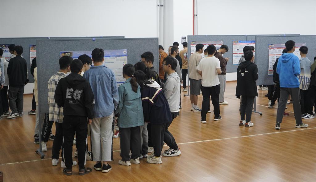 其他年级同学分批次集中观展,担任大众评审,分别从海报内容创新性、完整性,海报设计展示及海报解说5个方面进行线上打分,观展同学纷纷借此机会与现场学长学姐一同交流探讨,学习海报创作技巧和课题研究思路的同时,也对不同专业科研方向有了清晰的认识,同学们参与热情高涨,现场气氛热烈。