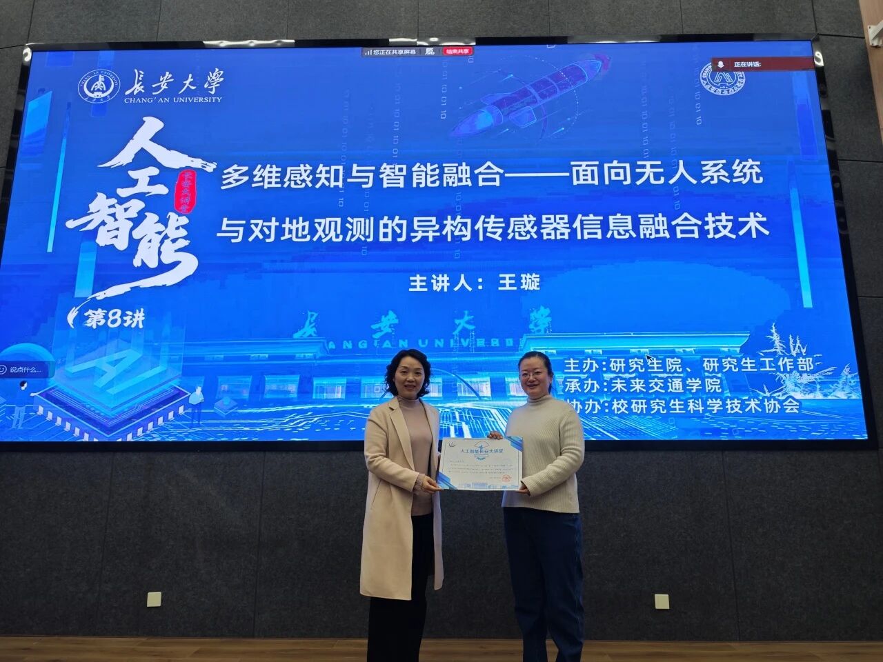 讲座尾声,崔华为王璇颁发了“人工智能”长安大讲堂纪念证书。