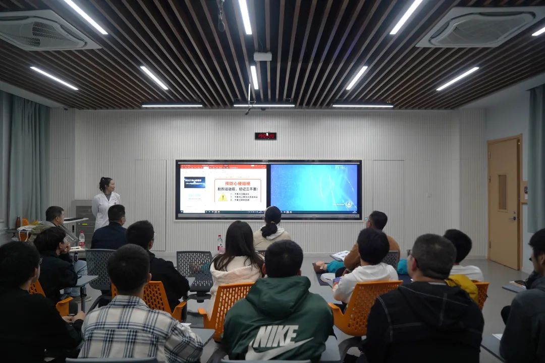 校医院医师齐梓伊从CPR(心肺复苏)和AED(自动体外心脏除颤器)切入,详细讲解了心脏骤停的医学概念、诱发原因,识别心脏骤停的关键要求以及CPR与AED的操作规程。针对非医护人员在遇到心脏骤停时应采取的重要步骤,强调了AED、胸外按压和人工呼吸三者的优先级以及对患者实施急救的注意事项,还进行了现场急救操作演练。齐梓伊鼓励同学们积极学习掌握使用AED的技能,若遇突发紧急情况时要敢于挺身而出,充分利用所学技能“救”在现场,努力做到“人人学急救、急救为人人”。