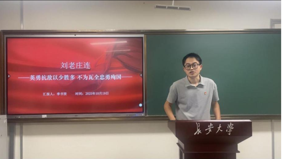 季书贤讲授微党课——《刘老庄连:英勇抗敌以少胜多,不为瓦全忠勇殉国》,从英雄事迹、英明永垂及青年感悟三个方面向参会党员介绍刘老庄连的故事。刘老庄连全体将士彰显了中华民族不畏强暴、血战到底的英雄气概,成为人民军队忠诚使命、舍生取义的精神丰碑,激励着后人传承“生命不息、战斗不止”的英雄血脉,在新时代续写保家卫国、服务人民的新篇章。