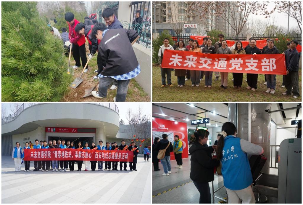 党支部组织学生参加“扎根‘七十五周年’迎校庆,育梦‘十五五规划’向未来”植树活动,师生协作植树培土,践行绿色发展理念,为校园增添新绿,增强了支部党员的责任意识与团队协作能力。学院组织开展“传承雷锋精神”志愿服务,志愿者们深入西安北站开展便民服务,为旅客提供路线引导、行李搬运等帮助,弘扬奉献精神,展现新时代青年的责任与担当。