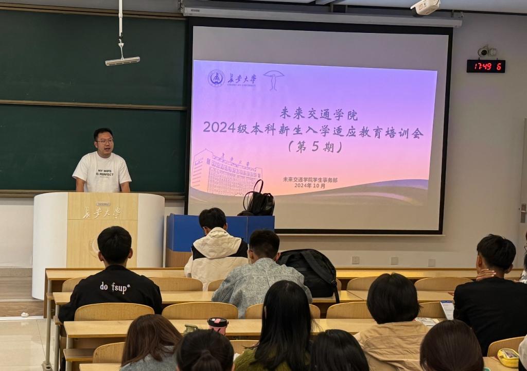 于北校区WH1301教室开展2024级本科新生入学适应教育培训会(第5期)暨奖励与资助教育培训。此次培训会由学院学生事务部副主任、2024级本科生辅导员刘志兴主讲,2024级全体本科生参加。