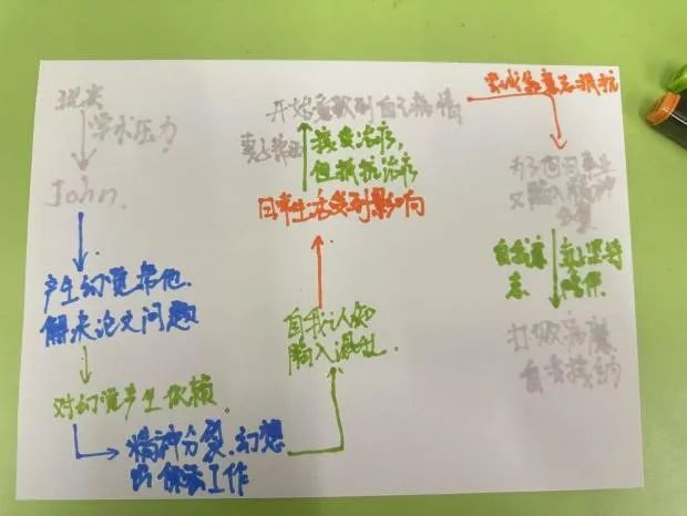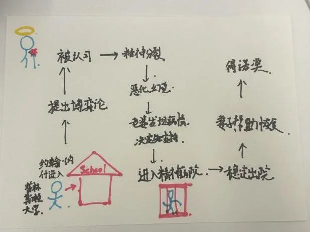 互动环节将活动推向高潮。参与者以小组为单位,结合冰山理论绘制“纳什心理地图”,标注其潜意识冲突(如童年创伤、社交焦虑)、意识层面的理性选择(如数学理想、家庭责任),以及二者对抗与融合的关键节点。一幅幅地图中,既有对幻觉角色“查尔斯”象征意义的深度剖析,也不乏对“爱与信念如何穿透精神迷雾”的温暖注解。这些迷宫的绘制为活动画上了圆满的句号。