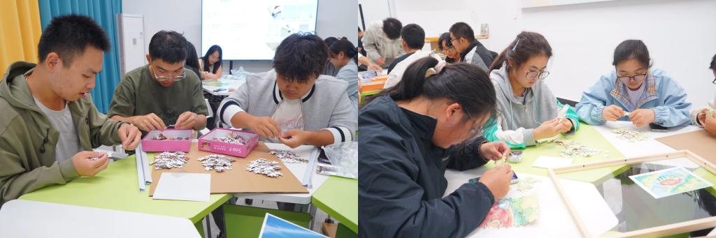 在拼图环节,大家全神贯注投入到拼图活动中。各小组采取不同的策略,有的分工明确,各司其职,各自完成拼图的一部分;有的集体行动,同心协力,集中完成拼图的各个环节。随着拼图渐渐完整,一幅幅完整的图画也浮现在了我们眼前。当最后一块拼图严丝合缝的补上空缺,同学们的心灵也在不知不觉中得到治愈和慰藉。