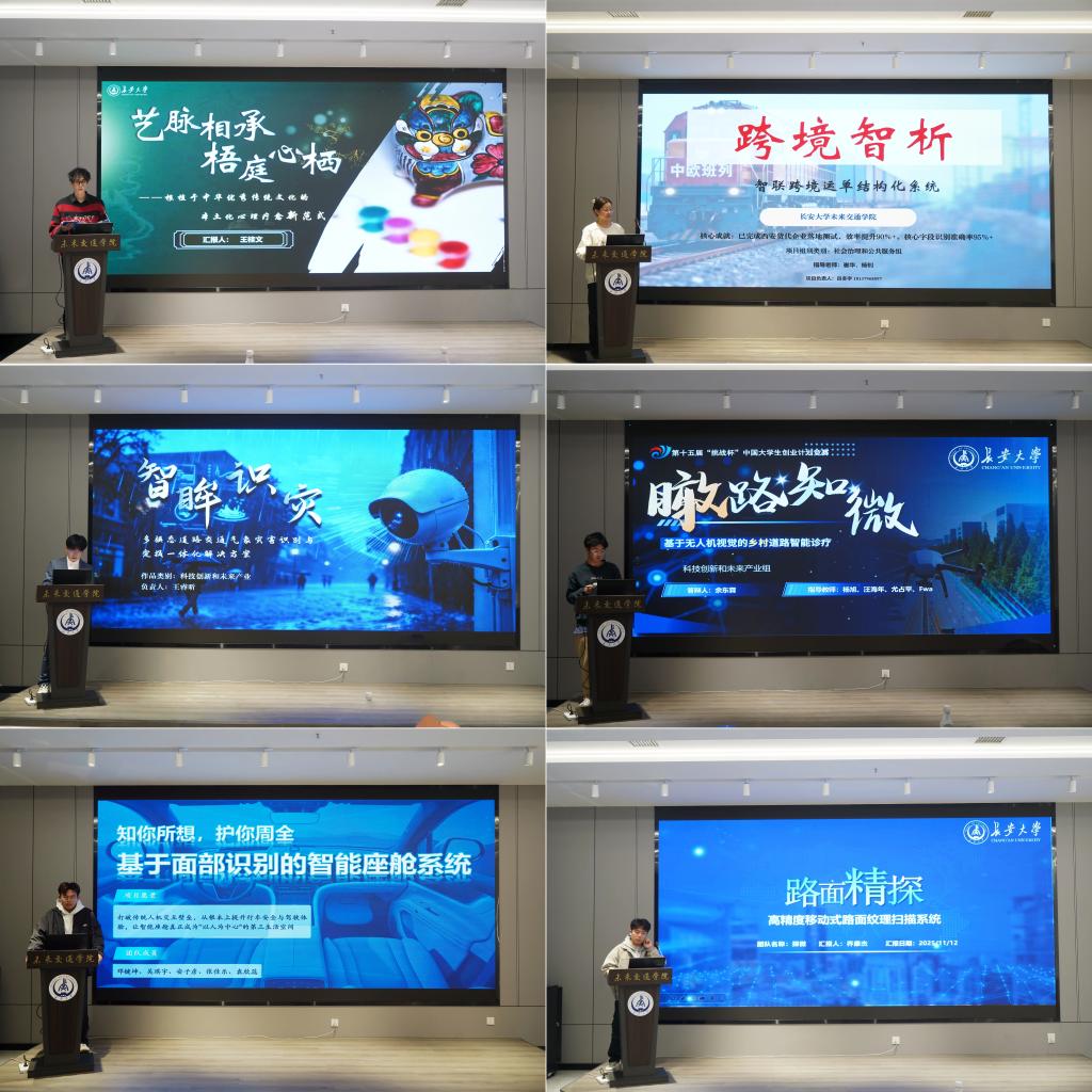 本届赛事共9支团队答辩,项目覆盖智能交通、文化传承、低空经济、心理健康等多个前沿领域。各团队立足实际场景、亲身案例、现行技术痛点与市场前景,经数据调研、实地考察与可行性考证,纷纷提出具备落地可行性的优质方案。“知你所想,护你周全”团队推出基于面部识别的智能座舱系统,借助大模型算法,围绕司机驾驶状态与注意力保障出行安全;“盛唐幻梦,只此唐巷”通过现场调研与大数据分析,以科技手段打造沉浸式复古街区,重现盛唐文化场景;“智眸识灾”开发多模态交通气象灾害识别系统,为灾害预警与定损提供一体化解决方案;“瞰路知微”依托无人机视觉技术,构建乡村道路智能诊疗平台;“艺脉相承”将心理疗愈与传统文化相结合,探索本土化心理健康新范式;“云帆飞控”搭建低空经济产业培训基地,助力无人机技术普及;“低空智配”设计无人机末端配送APP,优化物流“最后一公里”服务;路面精探相关课题聚焦高精度移动式路面扫描系统研发,提升道路养护智能化水平;智联跨境运单结构化系统项目则通过开发专属系统,为物流数据高效管理提供支撑。