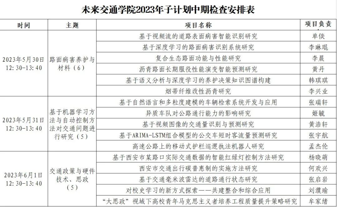 活动时间:5月30日至6月1日12:30-13:40 本次中期检查,根据各队伍题目不同,计划在三天时间内进行交流汇报,每场答辩将围绕同一题目类型开展,学院将邀请专业教师对项目逐一点评。中期检查各队伍顺序安排如下,同时欢迎感兴趣的同学前来学习交流。